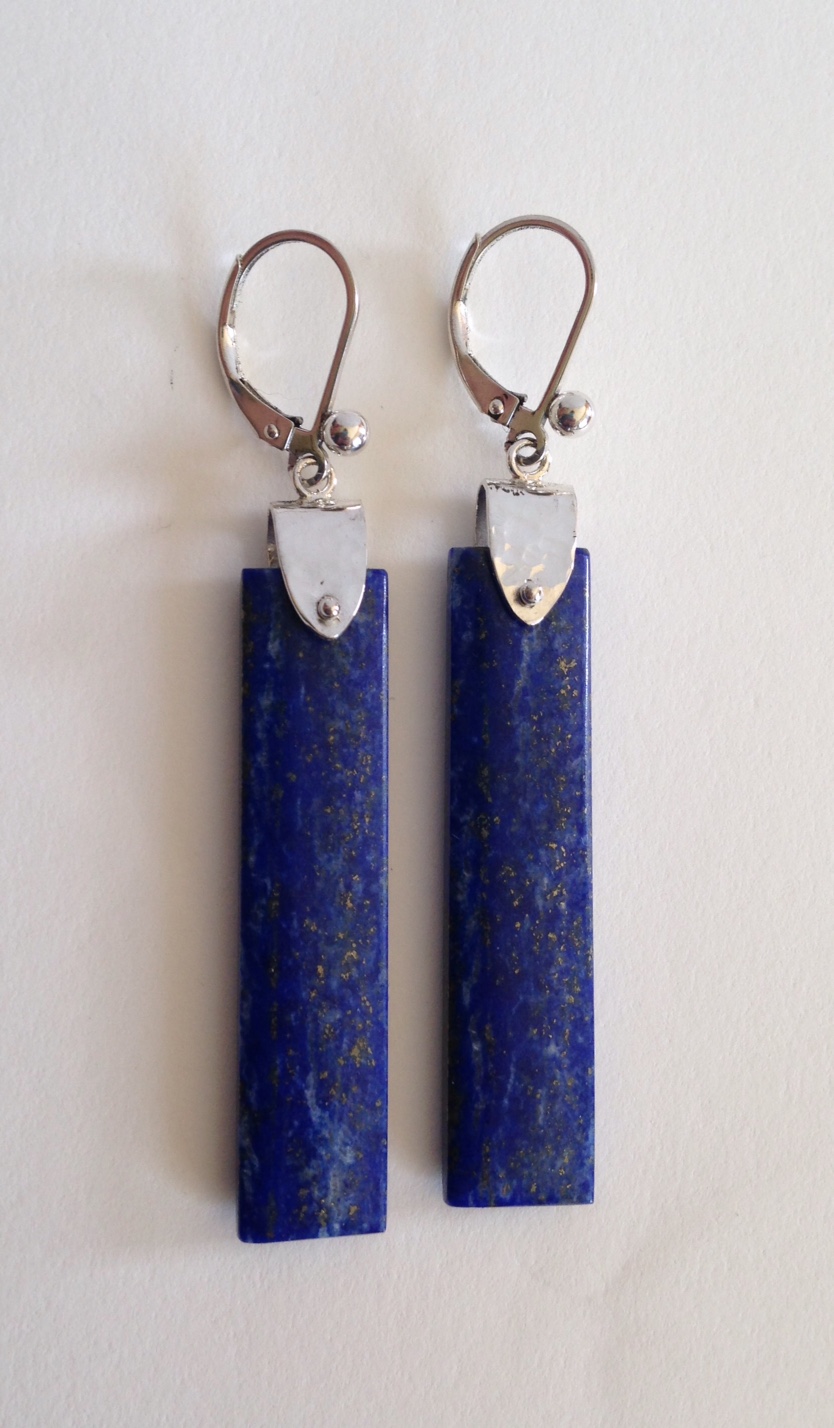 Exceptional natural Lapis Lazuli, long rectangle earrings with sterling silver hammered tops. This pair measures approximately 2 1/4″ x 3/8″. Easy to wear and comfortable lever back earrings that are contemporary and make a striking statement- simple and elegant. $129.