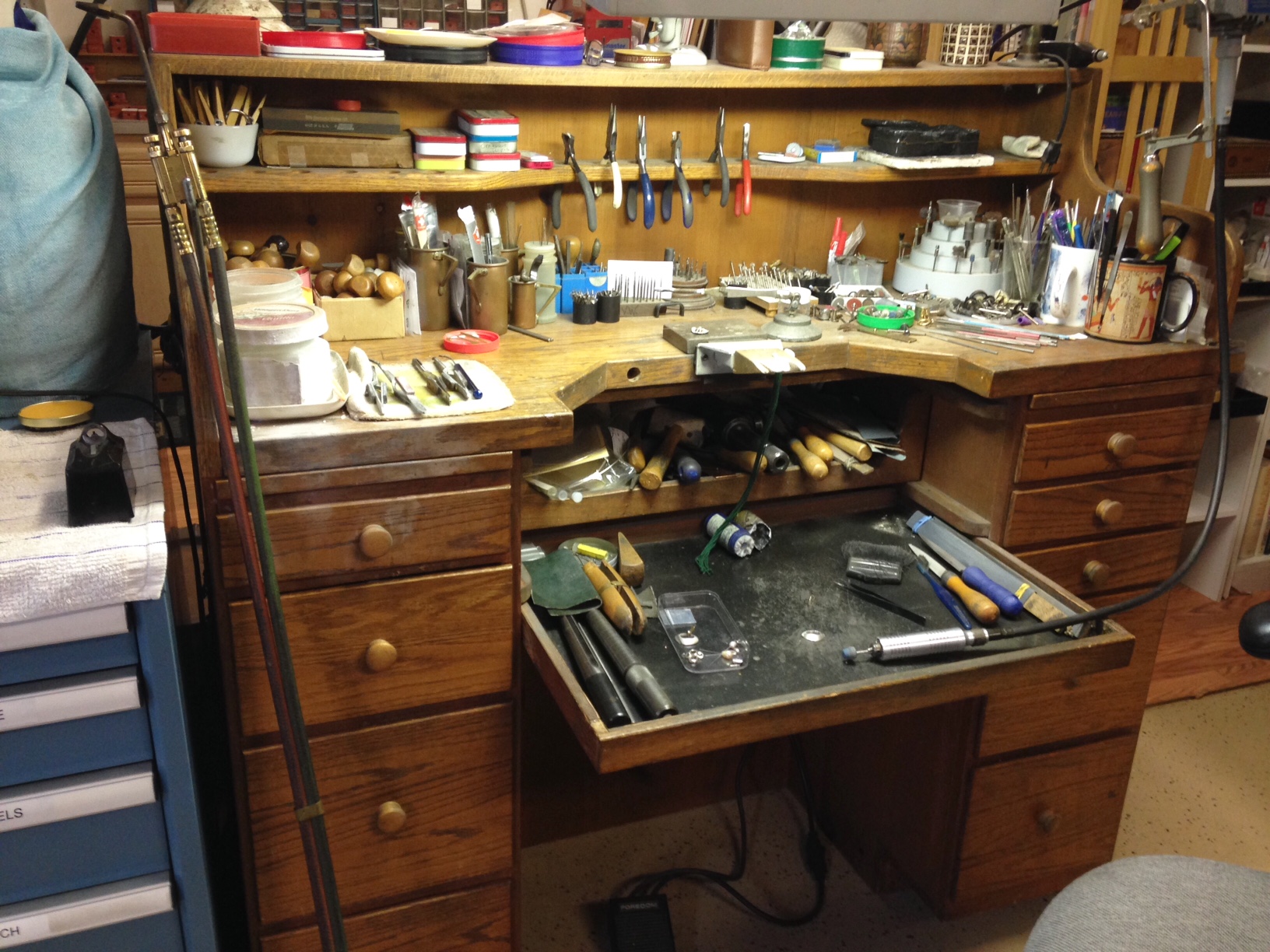 In my workshop, my workbench is one of my most favorite things in this world and where I spend much of my time. I also have a small antique workbench from the 1920’s with cast iron legs that I use for working on waxes. To me, workbenches are interesting and I love to see other jeweler’s shops especially their benches that reveal so much about them. I don’t have every tool like some jewelers seem to need, but what I have serves me well and I use just about everything I have. I finally have a large enough space where I have permanent work stations that I can keep set up to use in an instant. That’s a wonderful thing.