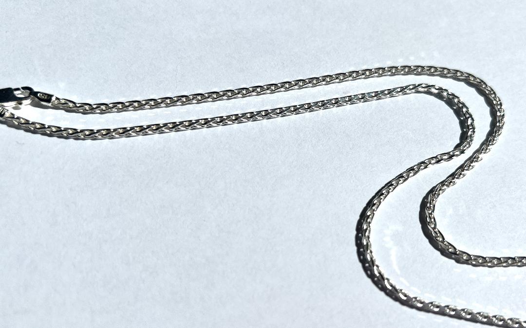 24″ x 2 mm Diamond Cut Wheat style chain in sterling silver (.925). The diamond cut gives a little extra brilliance and it is a fluid woven style chain. 2mm is approximately 1/8″ and is a substantial width for bolder pendants. $89.