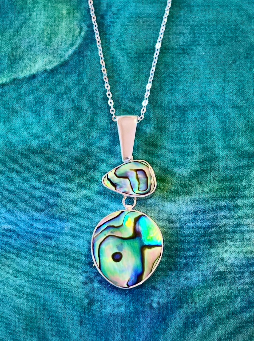 Double Abalone is a free form pendant made with sterling silver. The pendant length is 1 3/4″ and the sections swing. This gorgeous pendant is striking with flashy colors of green, dark blue, and purple in a balanced asymmetrical design. This is the exact pendant that you will receive.