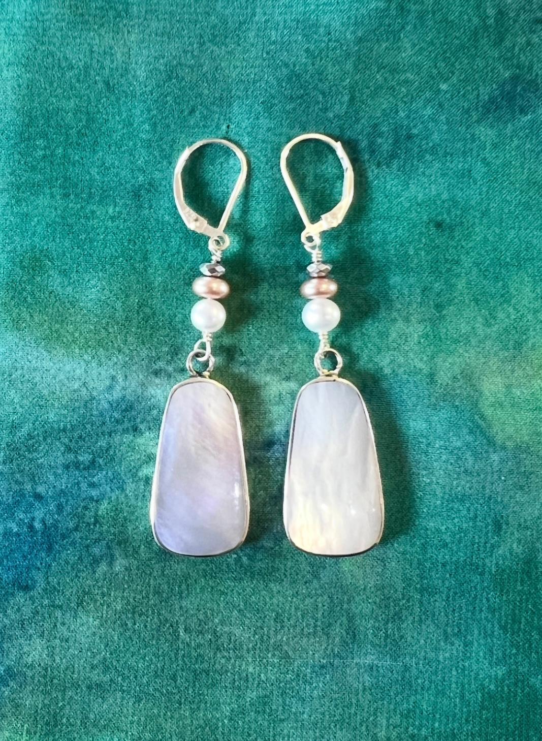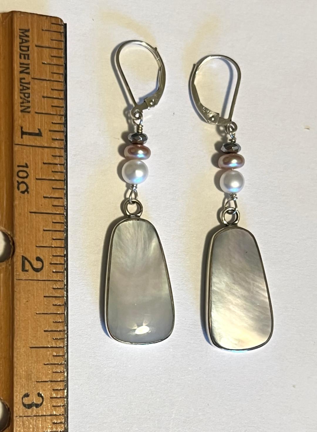 Mother of Pearl and freshwater pearls long and easy to wear dangle earrings with lever backs. The MOP has a body color of white with subtle iridescent overtones of pinks and greens. The overall length is just under 2 1/2″. They are long but also lightweight.