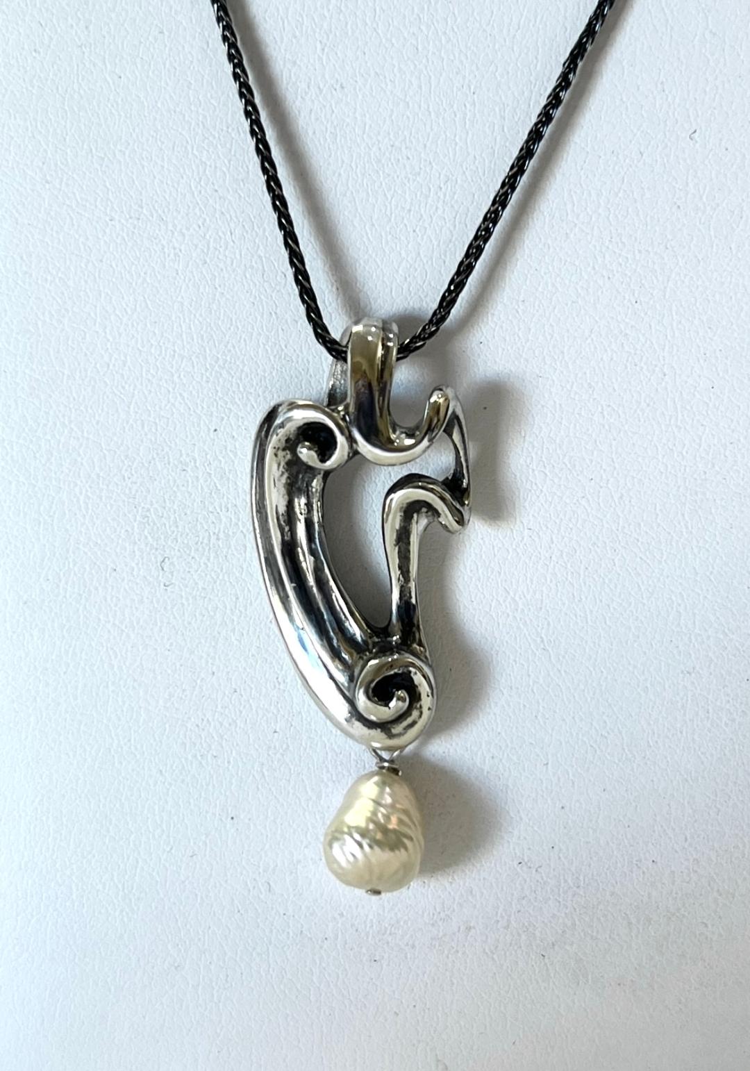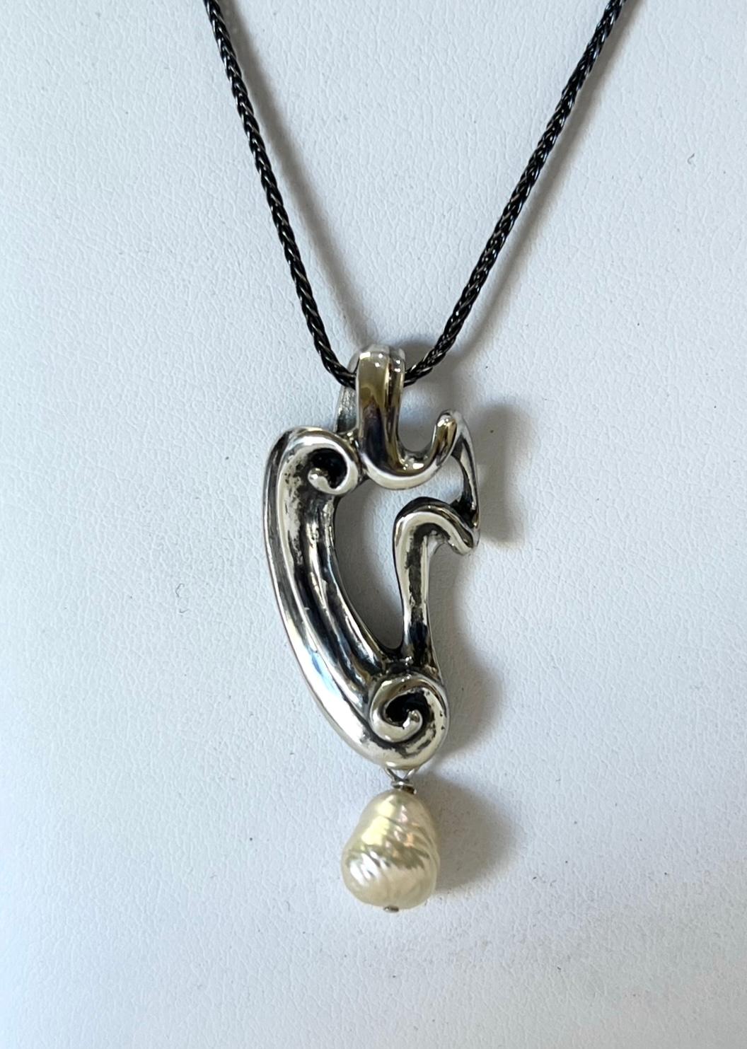 Valentina pendant in sterling silver with a Baroque Freshwater pearl drop, has flowing lines that are reminiscent of the Art Nouveau era and also has a contemporary flair. Valentina has an open center,with a swirling frame in a V shape, and has antique black in the crevices. This asymmetrical pendant is approximately 1 3/4″ long x 3/4″ wide. Shown with an 18″ black plating over sterling silver Wheat style chain that is sold separately. Other chain options available.